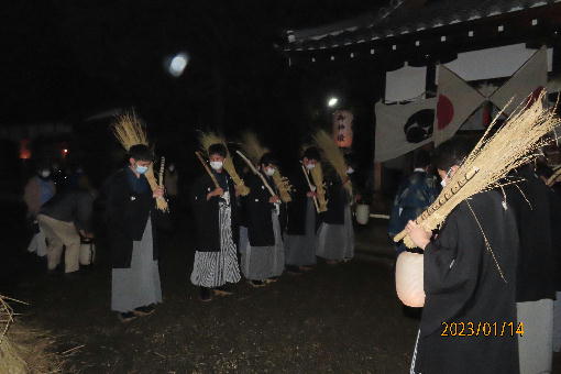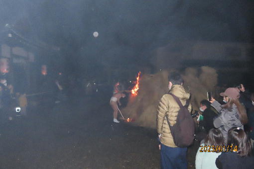 今年の奉火はコロナの感染防止のためマスクを付け声を出さないということから竹をたたくことやヘーヨ、ヘーヨ(平癒)の声出しを行わず条則の確認後はふんどし姿になり整然と手松明にかまどから決められた順に火をもらい静かに仮屋から出て大松明に火を付けました