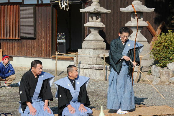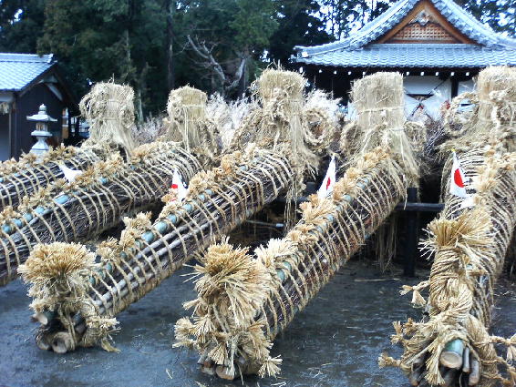 以来、家内安全、五穀豊穣、無病息災を祈願して1月第2土曜日に午前中神事式典を行い、午後から大松明の奉納します。夜には「平癒」のかけ声とともに知新連中ならびに神事中の者が一緒になって奉火する火を奪い合います。毎年夜8時前後に仮屋から一番火の手松明を手にした者が、大松明に点火する。