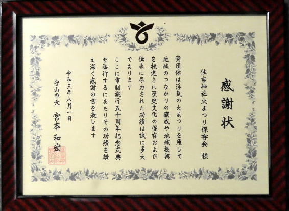 令和3年8月1日市制施行50周年記念式典において「住吉神社火まつり保存会」に対し感謝状をいただきました。