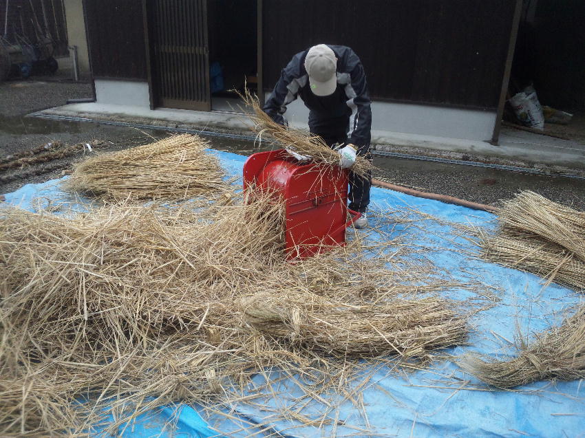 足踏み脱穀機をつかって藁をきれいにしてからしめ縄にしました。