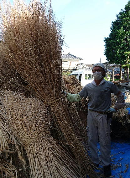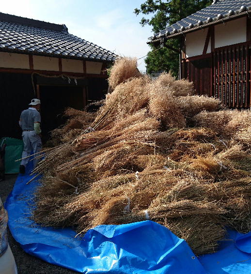台風が近づいており外に出しておけないので、左側に藁を固め菜種柄はとりあえずあいたところにおくことにしました。明日は長い菜種柄の大きさを揃えることにしています。