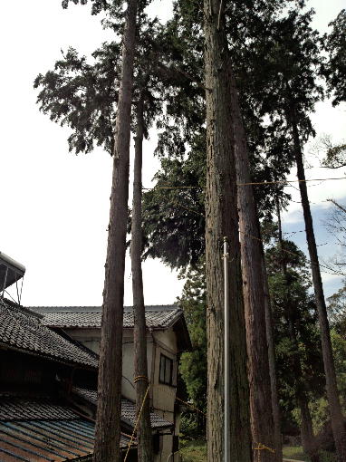 台風や長雨などで鎮守の森の樹木が民家の方へ倒れる恐れがあるととらえドープを張りその対策を講じました。