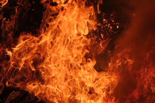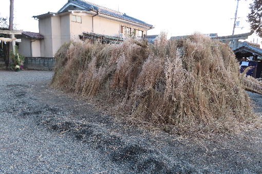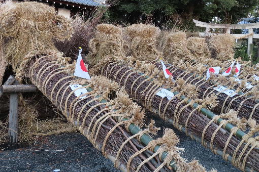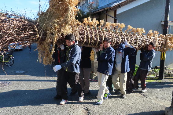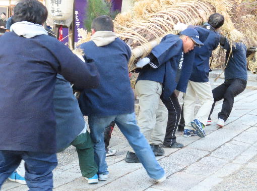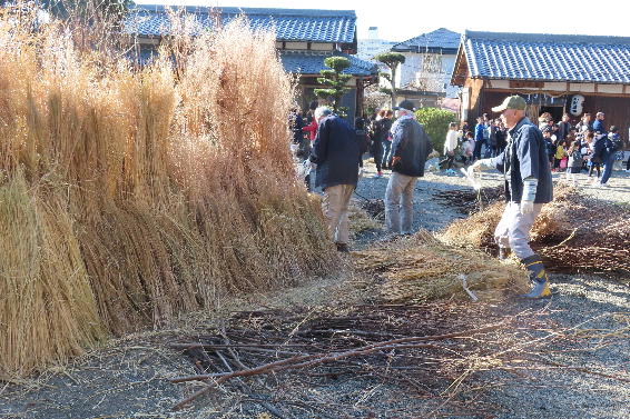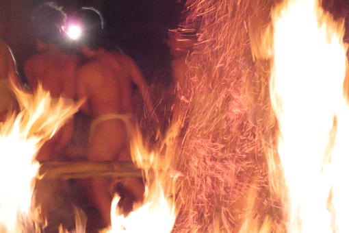 奉納された松明を夜に式典に向け飾り付けをしています。