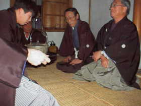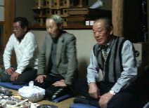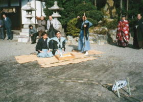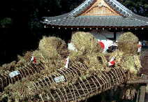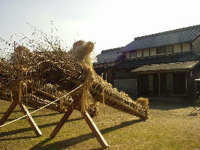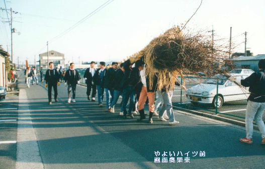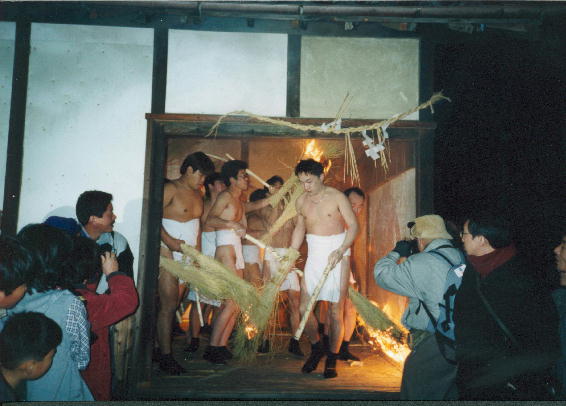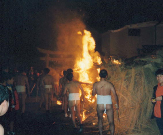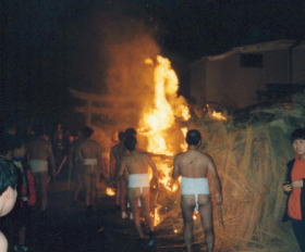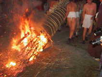 燃えさかっている大松明を威勢よく神社の外へ引き松明をする
